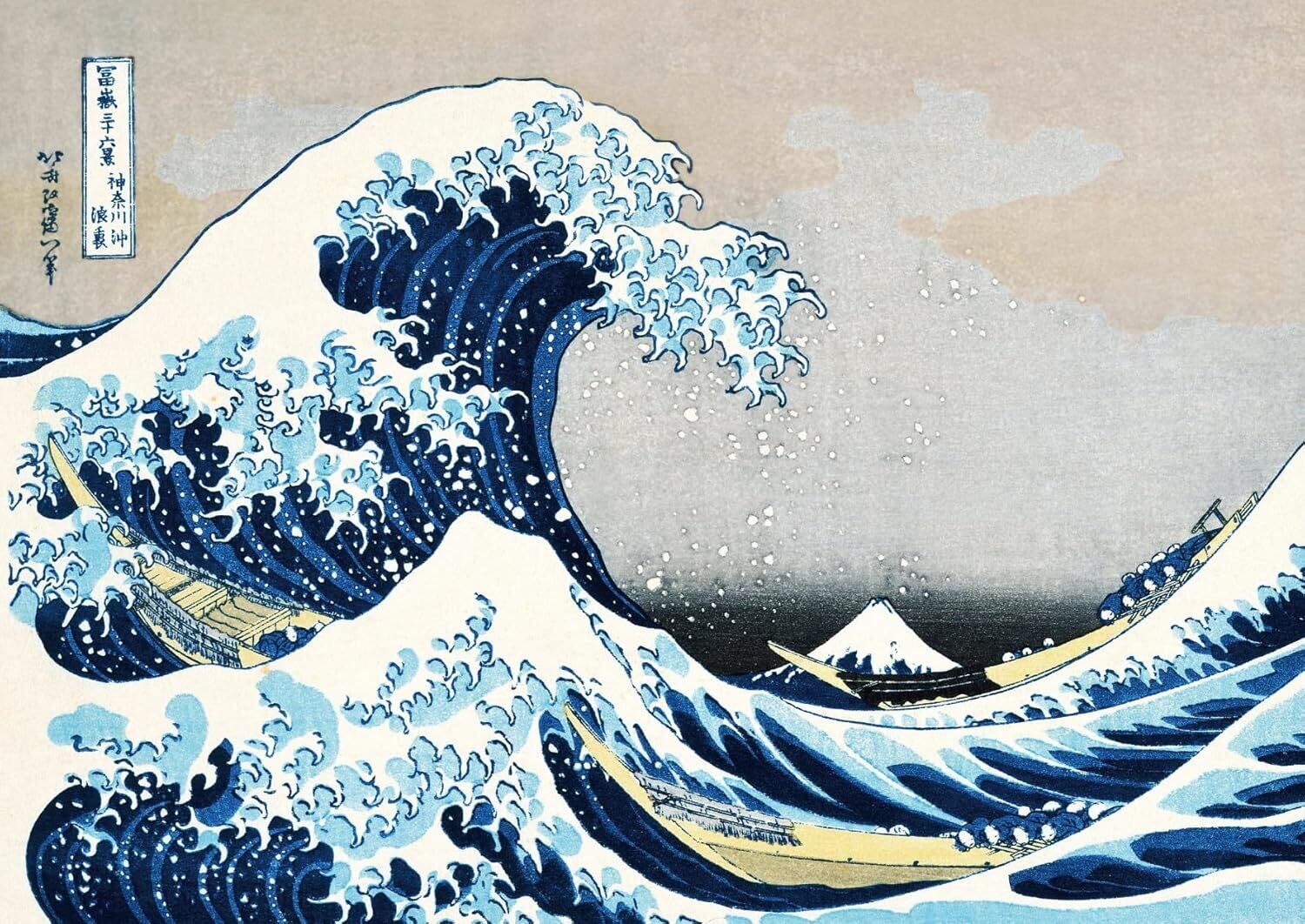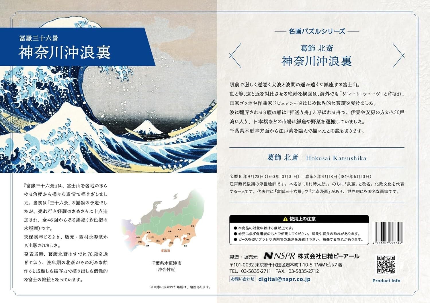 葛飾北斎 富嶽三十六景。 神奈川沖浪裏。浮世絵の原画を印刷会社が汚れ除去などのレタッチを施し綺麗に印刷したジグソーパズル。ピース数が少なくお子様から高齢の方まで楽しめます。介護や医療の現場にも人気。A3サイズ300ピースも販売しています。