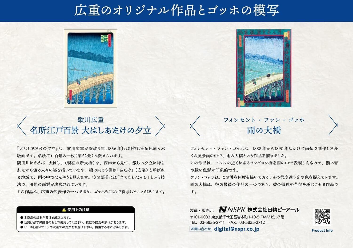 歌川広重の代表作の一つであり、ゴッホも油彩で模写したことがある作品となります。それを印刷屋さんが汚れ除去などのレタッチし綺麗に印刷したジグソーパズル。 相対するゴッホの作品も販売しております。「フィンセント・ファン・ゴッホ 雨の大橋 」