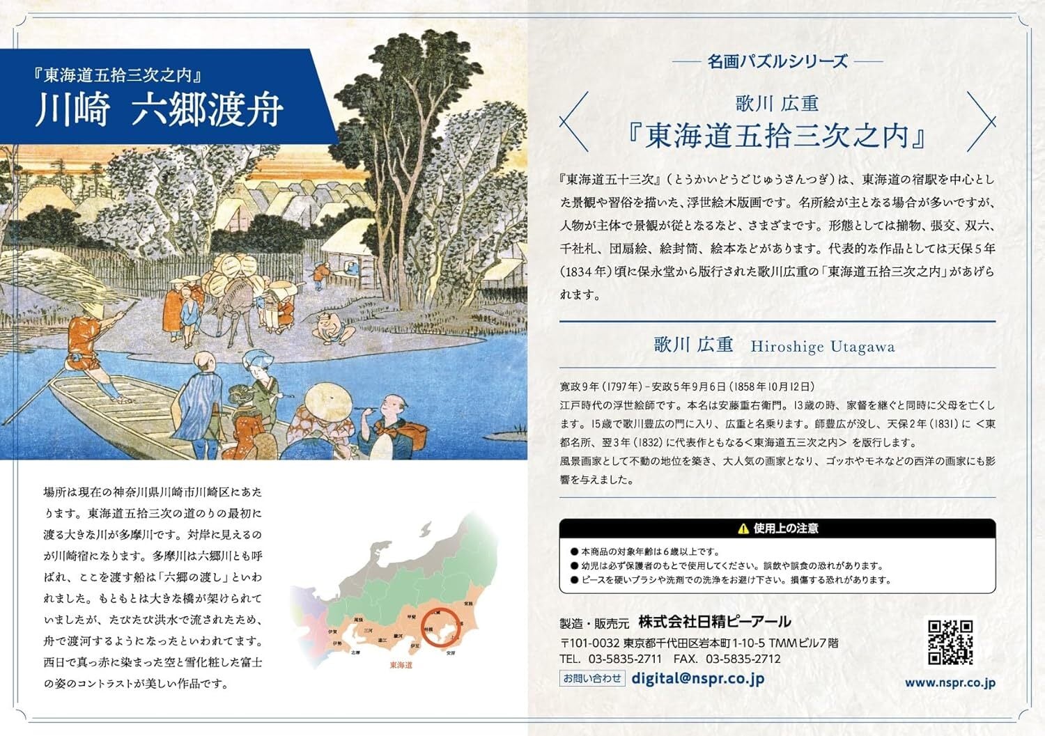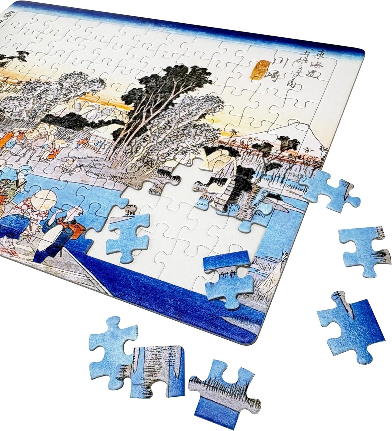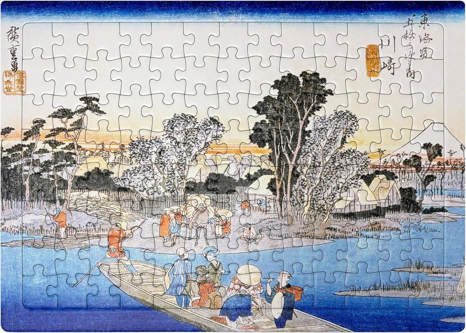 歌川広重。川崎 六郷渡舟を印刷屋さんが元画像をレタッチし綺麗に印刷したジグソーパズル。サイズ:約A4サイズ(294mm×210mm) ・1ピースの大きさ:約20mm×20mm ・ピース数:104ピース ・表面の紙質:上質紙